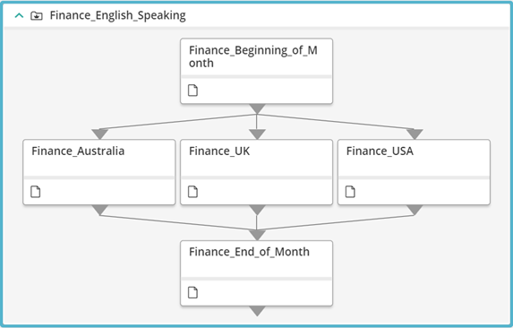 Finance_Australia, Finance_UK, and Finance_USA jobs begin execution once Finance_Beginning_of_Month successfully completes execution—provided that the successor jobs have fulfilled their other prerequisites. Finance_End_of_Month begins execution once all three of its predecessor jobs successfully complete execution, and once it has fulfilled all other prerequisites.