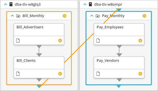 The following image shows the SMART folder Bill_Monthly, on Control-M/Server dba-tlv-w8glq3, connected by a global event to Pay_Monthly, a SMART folder successor on Control-M/Server dba-tlv-w8ompr: