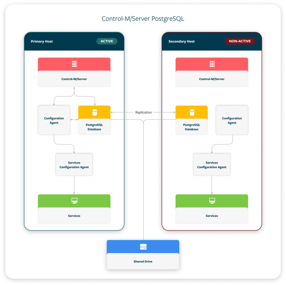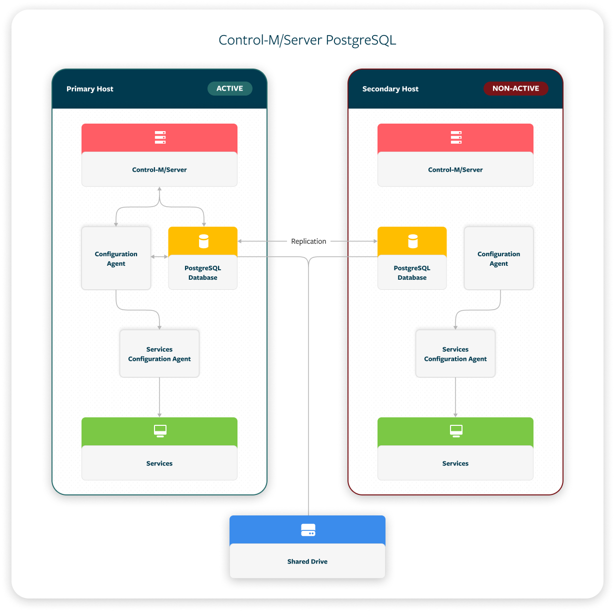 The self-hosted Control-M/Server High Availability solution with a dedicated BMC PostgreSQL database supports both a manual failover of the Control-M server along with PostgreSQL database replication. Control-M/Server is installed on the same host as the PostgreSQL database on the primary and on the secondary. The dedicated PostgreSQL database version must be the same on primary and secondary.