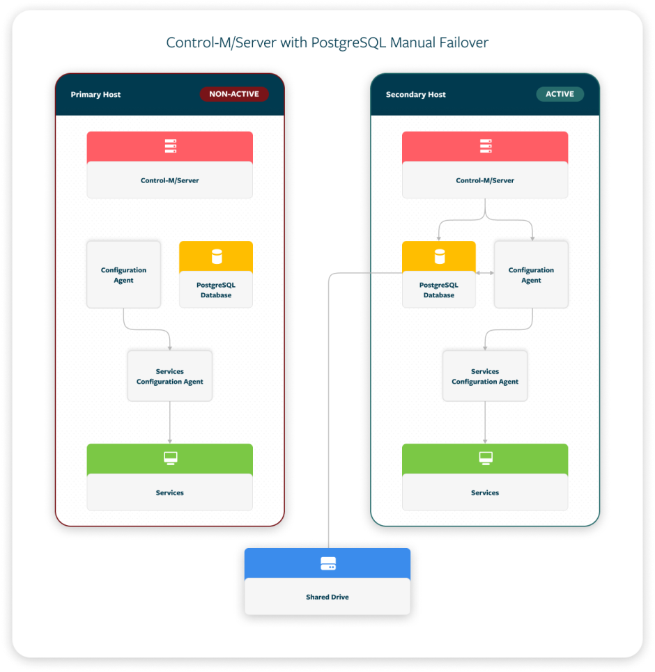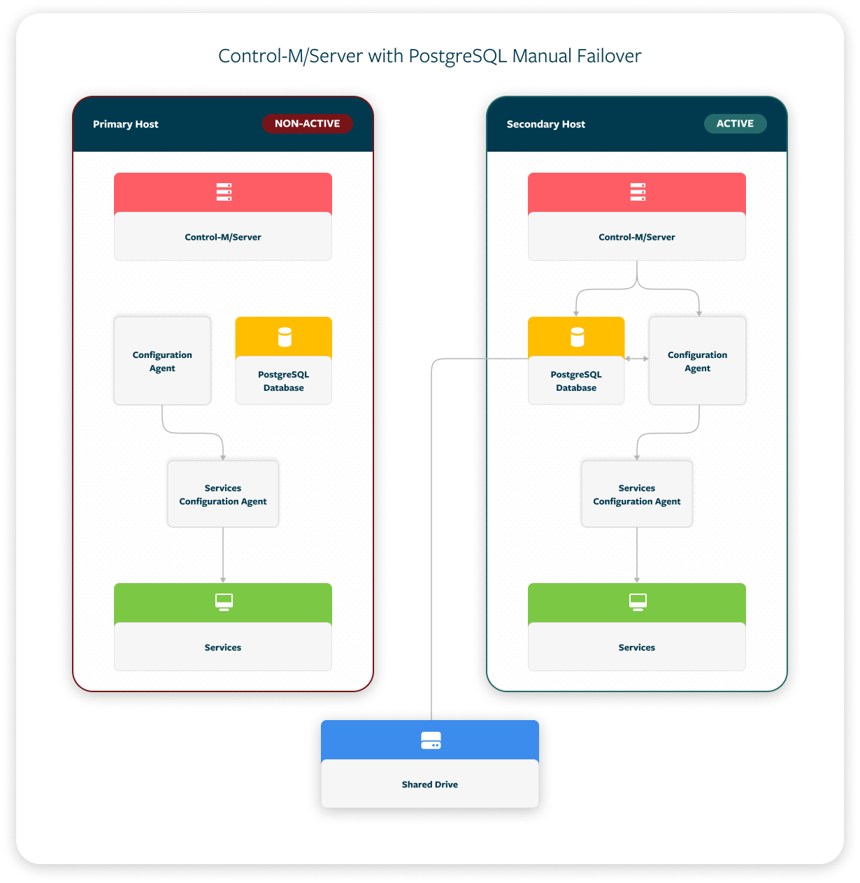 This procedure describes how to manually fail over the Control-M/Server and PostgreSQL database server to a secondary host.