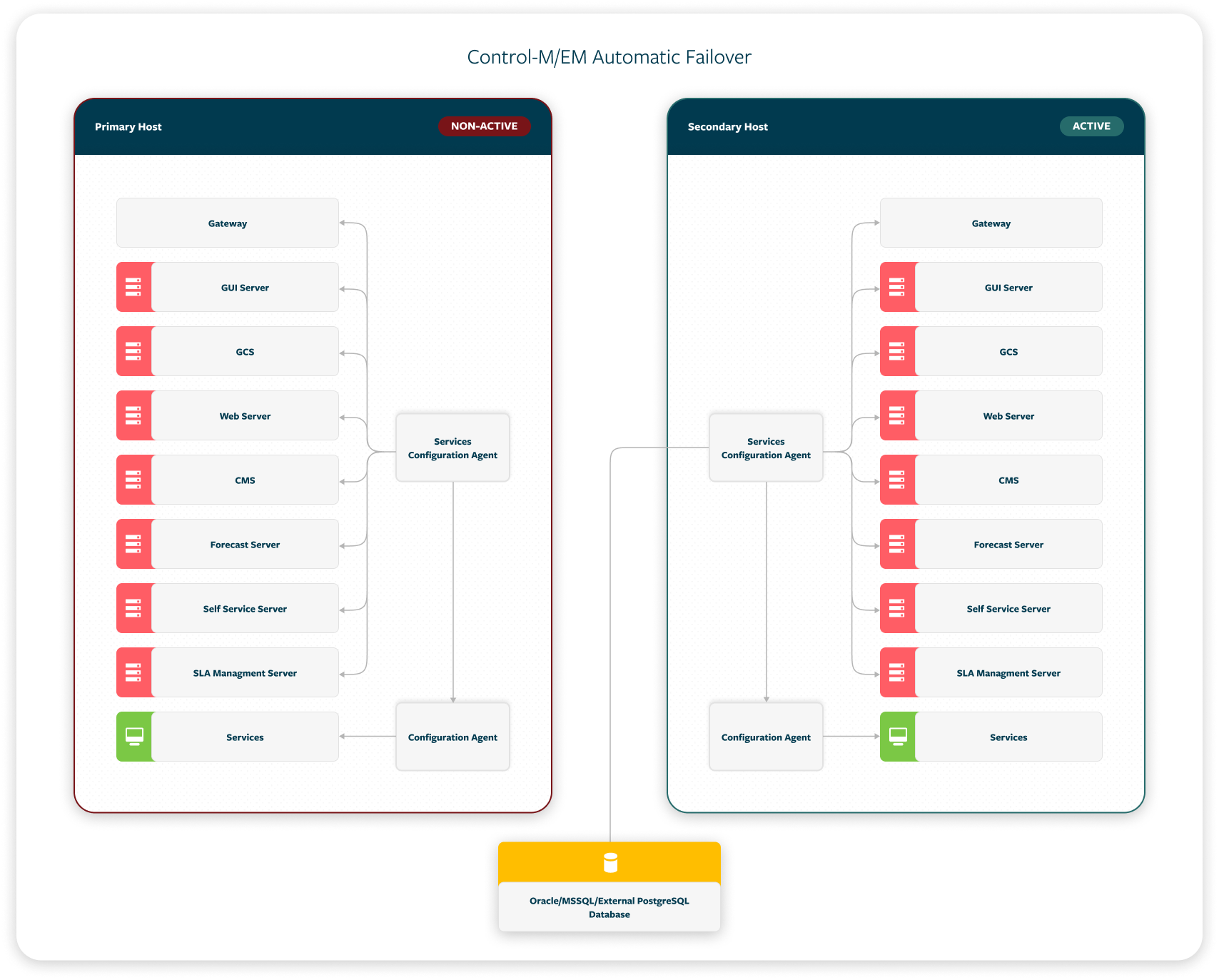Automatic Failover: The secondary Configuration Agent automatically takes control and resumes production, when it detects that the primary Control-M/EM or Control-M/Server and its primary Configuration Agent have unexpectedly stopped.