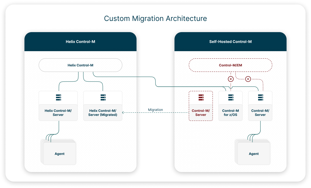 Helix Control-M Custom Migration: Migrates your self-hosted Control-M/EM data and enables you to perform an enhanced full migration or a customized migration. The customized migration enables you to determine—based on your organizational needs and the results of the qualification scans—which Control-M/Servers migrate and become Helix Control-M/Servers, and which Control-M/Servers remain self-hosted, but connect to Helix Control-M Unified View.