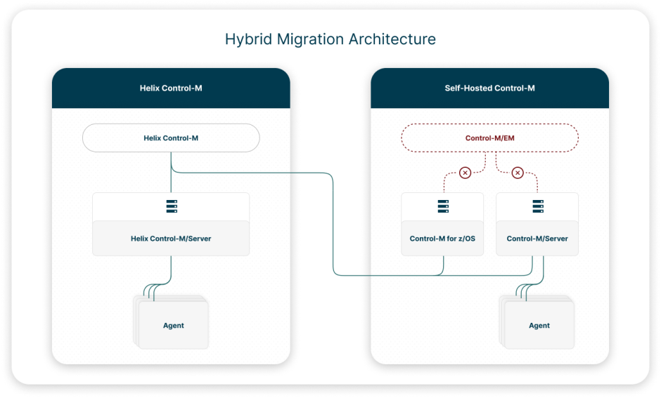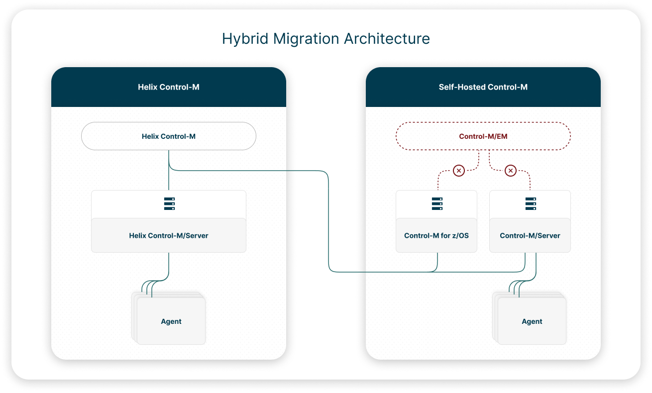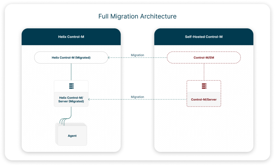 Helix Control-M Full Migration: Migrates your Control-M/EM data and all Control-M/Servers to Helix Control-M. This eliminates the need to install and maintain Control-M/EM, Control-M/Servers, and their associated databases.