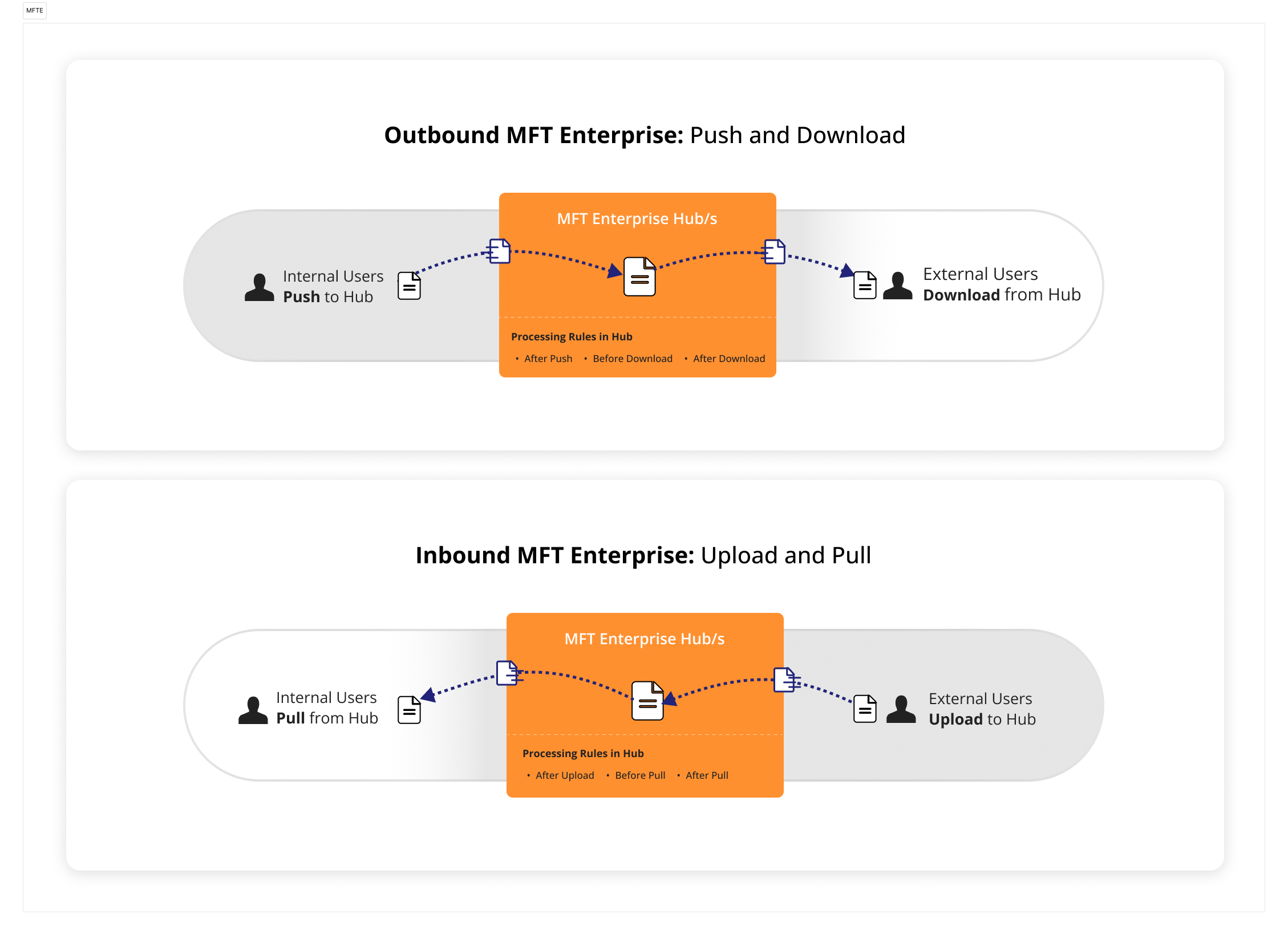 The following diagram shows how MFT Enterprise handles processing rules for uploaded or downloaded files by internal or external users.